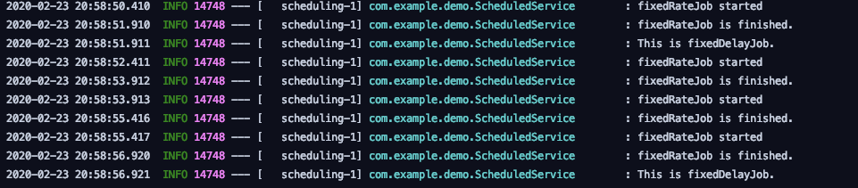 - FixedDelayJob과 FixedRateJob 양 쪽에 스케줄링이 걸려있으면 정확한 비교가 안 됩니다. FixedDelayJob에 스케줄링이 되어있을 경우엔, FixedRateJob의 @Scheduled Annotation을 지워야만 합니다. 자세한 이유는 후술하겠습니다.