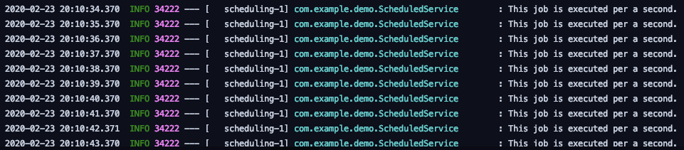 위의 Service는, 단순히 1초에 한번씩 로그를 찍는 메소드를 가지고 있습니다. 실제 로그를 보면, 정말로 1초에 한번씩 실행되었음을 확인할 수 있습니다. 이는 Scheduled에 같이 들어간 fixedDelay 프로퍼티가 1000으로 설정되어 있기 때문입니다. 눈치 채셨겠지만 이 프로퍼티는 ms단위이므로, 500을 넣으면 0.5초, 3000을 넣으면 3초에 한번씩 실행하도록 설정할 수 있습니다.