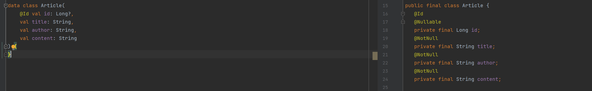 즉, 코틀린에서는 롬복을 쓸 이유가 전혀 없습니다. @Getter @Setter @Data 등의 어노테이션이 이미 코틀린 언어 자체에 내장되어 있으니까요.